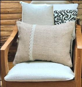 These Double Lined Hessian (also known as Burlap) and Lace Decorated Cushions offer a Vintage & Farmhouse Feel to a Home.